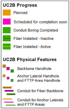The status of the project is indicated on the map according to the legend at the right.  (the legend is also accessible in the map by clicking on the “UC2B Progress” layer in the Layers list)