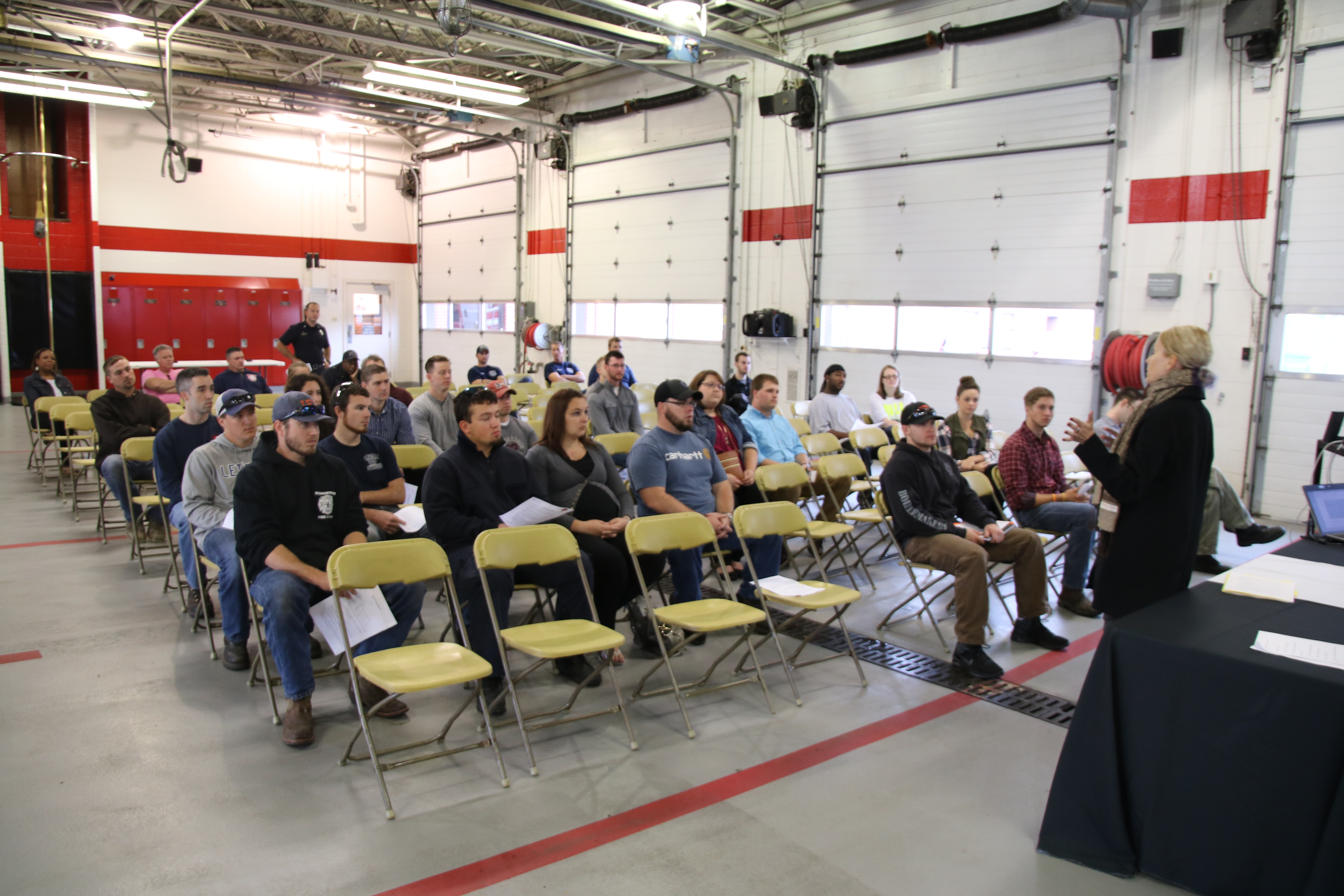 Approximately 25 community members attended the Probationary Firefighter Recruitment Information meeting held on Saturday, October 15 from 10 a.m. – Noon at Fire Station 1. This informational meeting was open to anyone interested in a career as a City of Champaign firefighter and desired more information about the entry-level process. Presenters for the event were: Deputy Chief Ferber; Stacy Rachel, HR Specialist; Jason Rector, firefighter; John Hoskins, academy probationary firefighter; Mike Brady, experienced firefighter; Gary Gula, Fire Captain; and Jason Dillingham, firefighter.