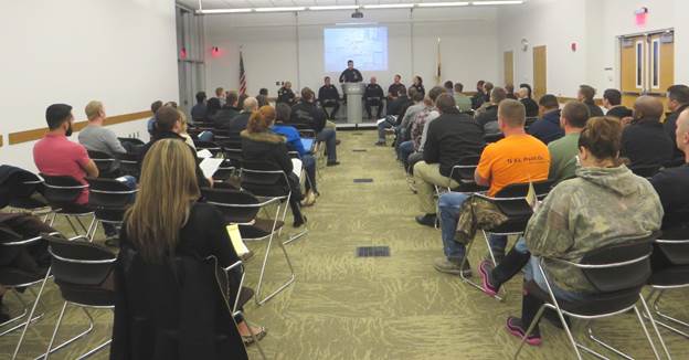 Approximately 50 prospective candidates attended the Champaign Police Departments 2017 Entry Level Police Officer Recruitment Information meeting on January 24, at the Champaign Public Library. Chief Anthony Cobb welcomed and thanked everyone that attended. A panel of Police Lieutenants, Sergeants, SWAT., experienced Police Officers and probationary police officers were present. The recruitment and information meeting focused on the police recruitment timeline and process, and the day in the life of a probationary police officer. Several people stayed afterward to chat with officers.