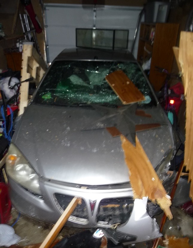 - The lower pane of the overhead garage door was damaged and covered with plywood.