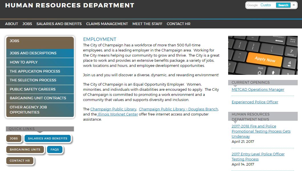 Highlights of the refreshed HR site include more in-depth content than the previous site, user-friendly navigation, and a bank of Frequently Asked Questions.  The “Jobs” section is much more robust and provides insight into the various steps of the hiring process.  The “Salaries and Benefits” page captures information such as salary schedules, employee compensation reports, and fringe benefit summaries and places them in one easy-to-find location.  Other major improvements to the site can be found under the “Claims Management” page.  Users can submit potential claims directly through the Liability Claim form, now available on the site.  They are also able to access several maintenance tables and maps to help determine if a potential claim falls within the City’s jurisdiction, as some streets are maintained by the State and some by the University of Illinois.