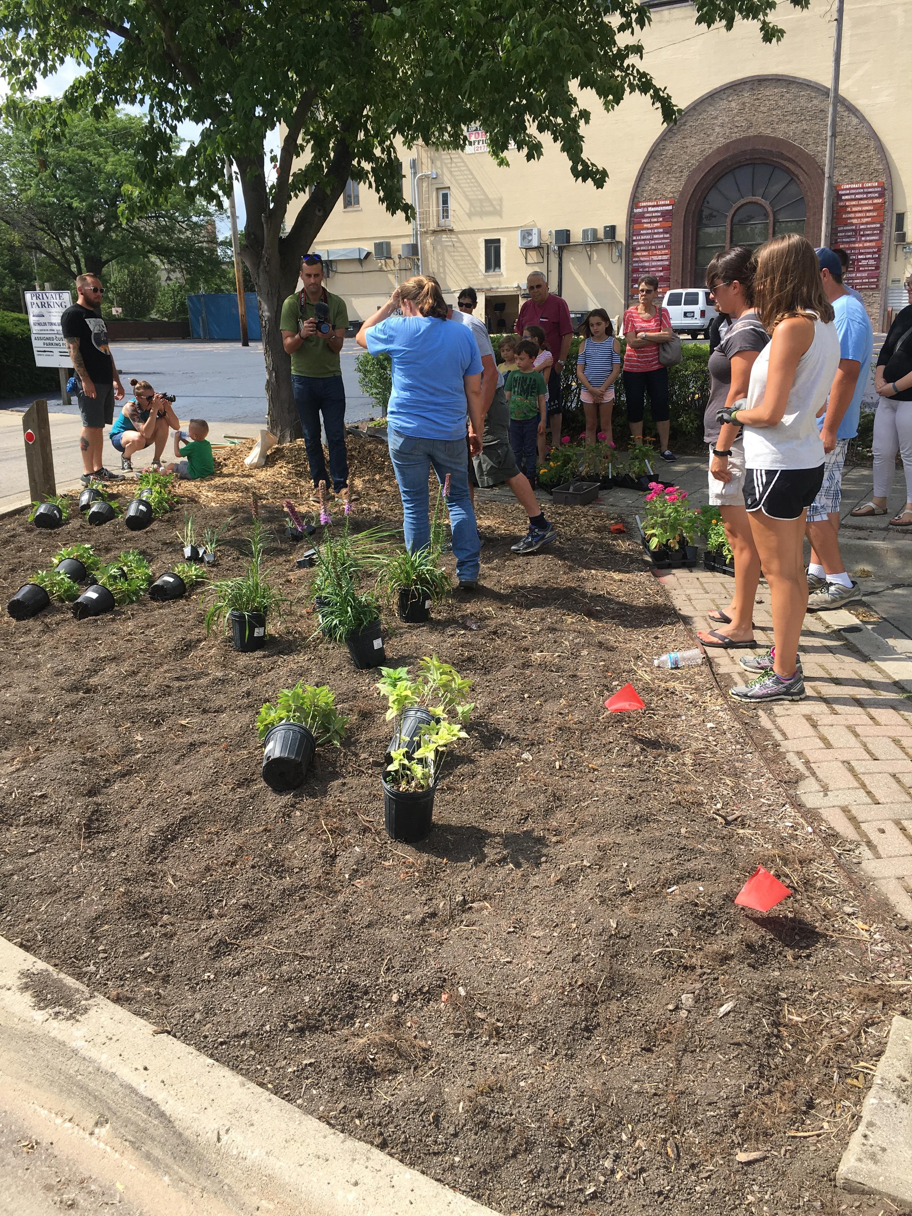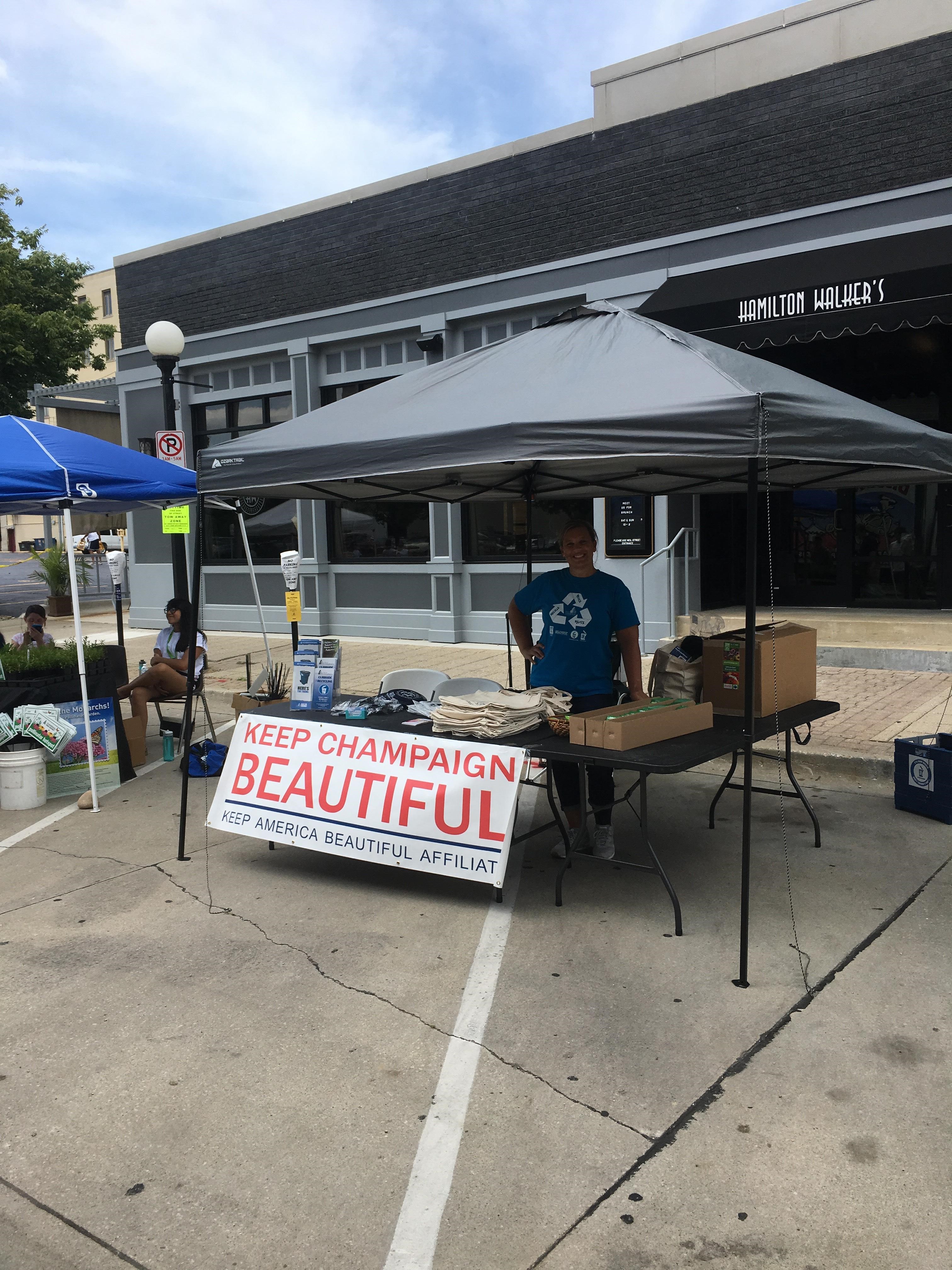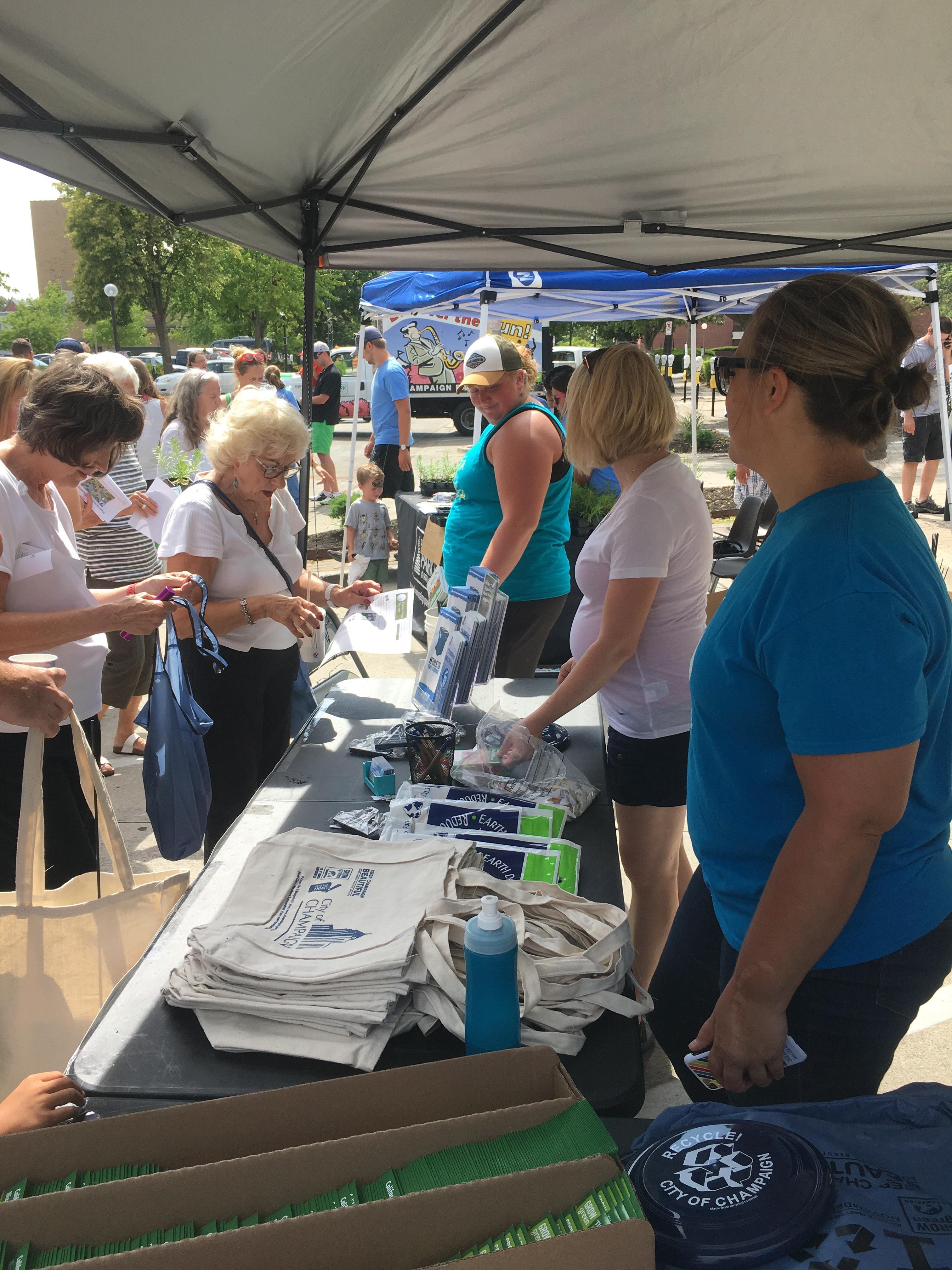 Keep Champaign Beautiful was a sponsor of the Champaign Park District’s Monarch Summer event held on Sunday, July 9. The event was designed to educate participants on the importance of pollinators in the environment and demonstrate ways they can assist in sustaining the pollinator population. There were about 250 people in attendance. The event began with the screening of two short documentaries at the Virginia Theatre on pollinators. Opening remarks were provided by Councilmember Tom Bruno. Following the screenings, participants were invited to visit vendors on Park Street between Neil and Randolph. Keep Champaign Beautiful provided free Zinnia and pollinator mix seeds along with recycling information and promotional giveaways including reusable shopping bags. The Champaign Park District also provided free Milkweed and Aster plants for participants to take him and incorporate into their gardens. The Milkweed and Aster plants provide the ideal environment for pollinators including the Monarch butterfly. Volunteers also participated in planting one of the parking islands on Park Street with vegetative materials conducive to attracting pollinators. Senior Planner Lacy Raines-Lowe, Environmental Sustainability Specialist Nichole Millage and Code Compliance Manager David Oliver represented Keep Champaign Beautiful at the event.