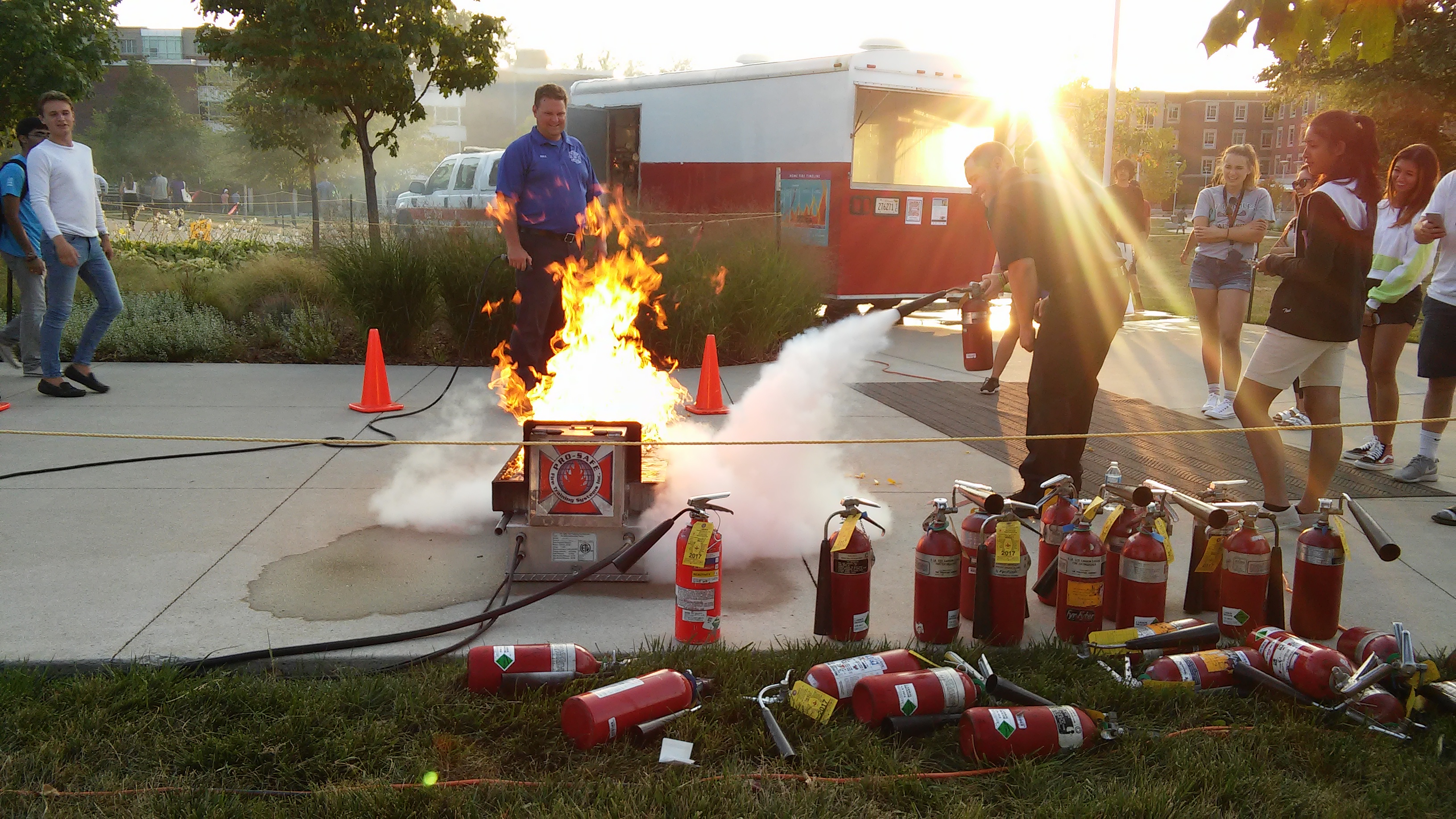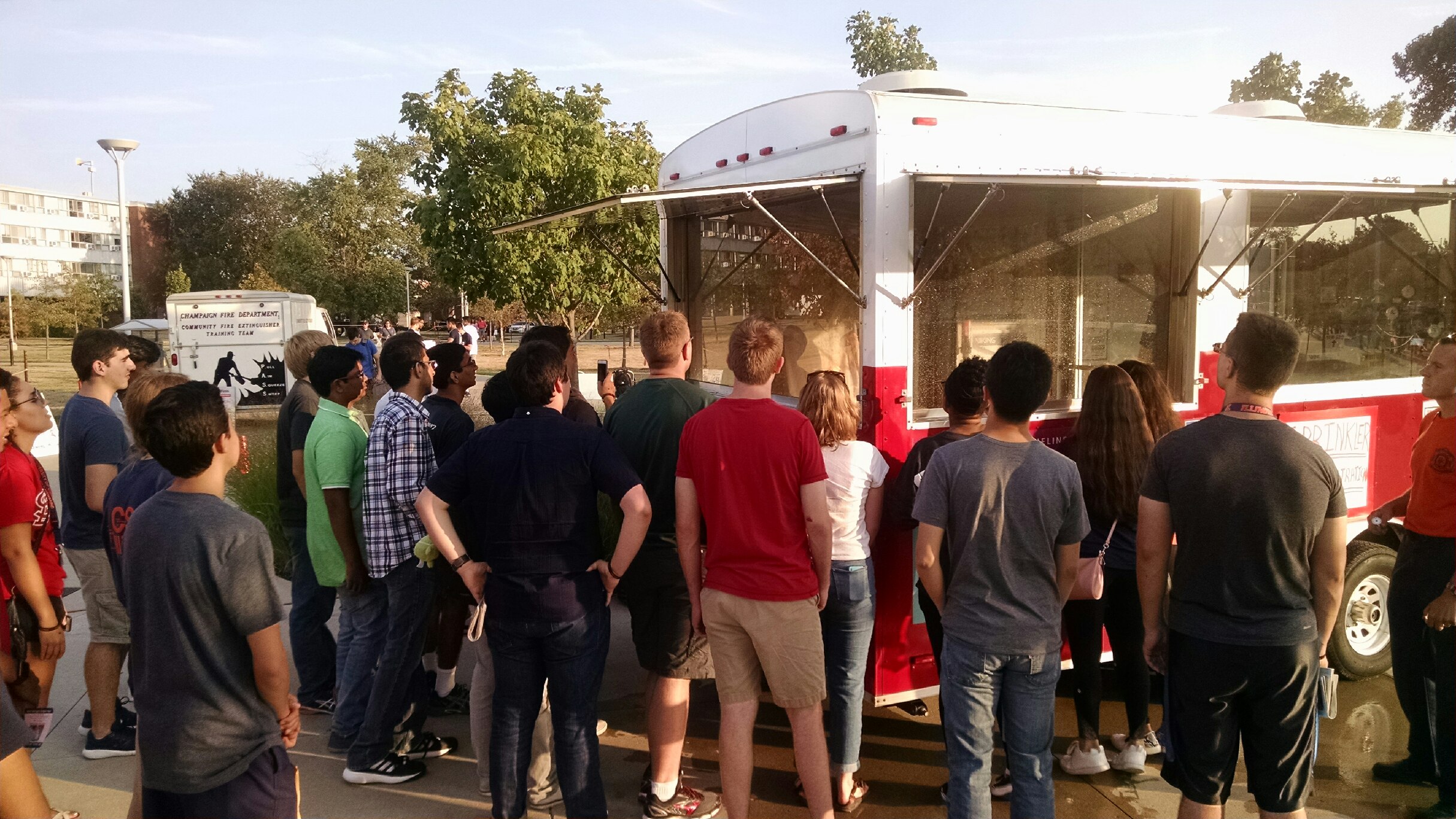 Champaign Fire Department, Neighborhood Services, and METCAD partnered with other agencies and organizations to share their expertise in the Ikenberry Housing Quad along 301 E. Gregory. Champaign Fire Department provided music, an opportunity to learn to use a fire extinguisher at a live fire simulator and Surviving Your Next Night Out, an informative session on public assembly safety. Firefighters stressed the importance of sprinkler systems with a live fire sprinkler demonstration provided in conjunction with the Northern Illinois Fire Sprinkler Advisory Board. Students learned from 9-1-1 METCAD Dispatchers about translation services offered.