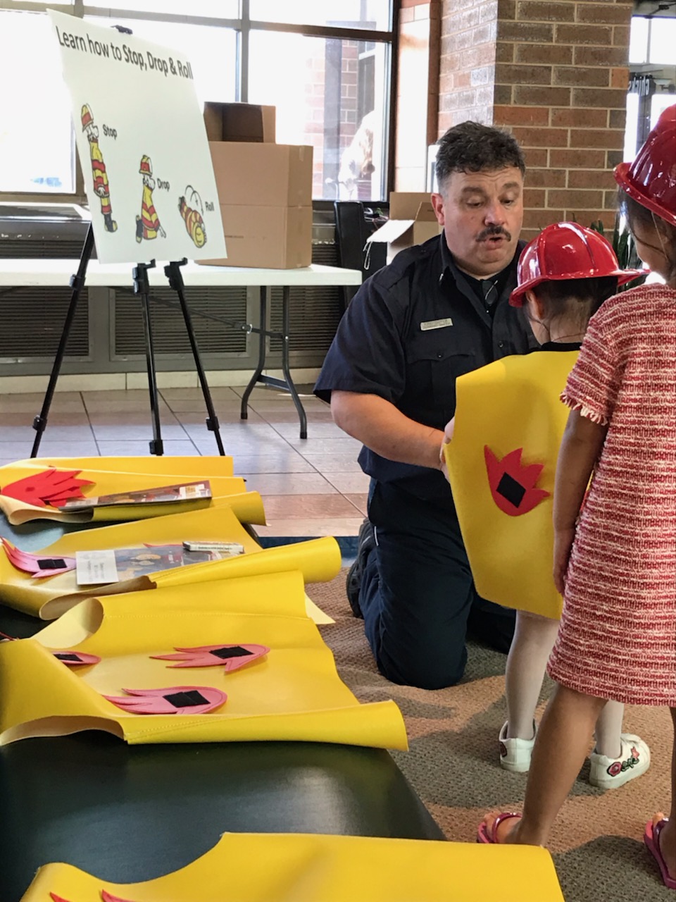 Kids and their families got to practice “Stop, drop, and roll” while firefighters reinforced the importance of what to do when someone’s clothes catch fire. Kids also helped identify dangers found around the home in a miniature safety house. Freddie the Firetruck sang along with the kids and stressed what to do if they found matches around the home. Finally, kids of all ages were able to take part in a touch-a-truck outside the Food Court and both sit inside the truck and look at the equipment used by firefighters.