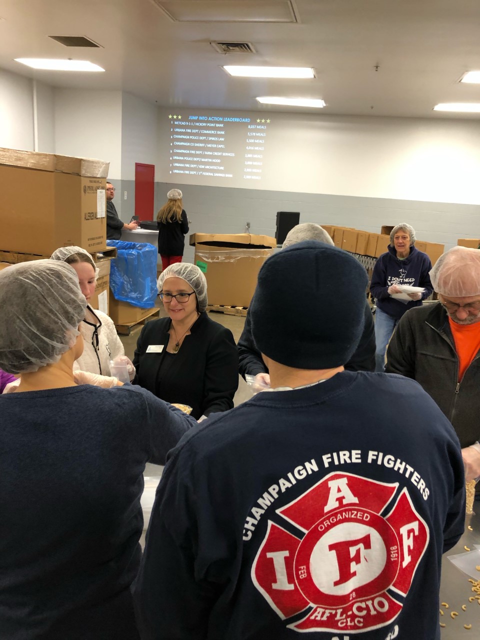 First responders from Champaign Police, Champaign Fire, METCAD 9-1-1, and Mayor Feinen participated in the Eastern Illinois Foodbank “Jump into Action” repack event on December 2-3, 2019. Teams from local public safety departments volunteered their time and went head-to-head to compete to see who could repackage the most meals in one hour. Financial donations to support a team were also factored into the competition to boost packaged meal totals. The friendly competition resulted in a total of 60,425 meals for those in need.