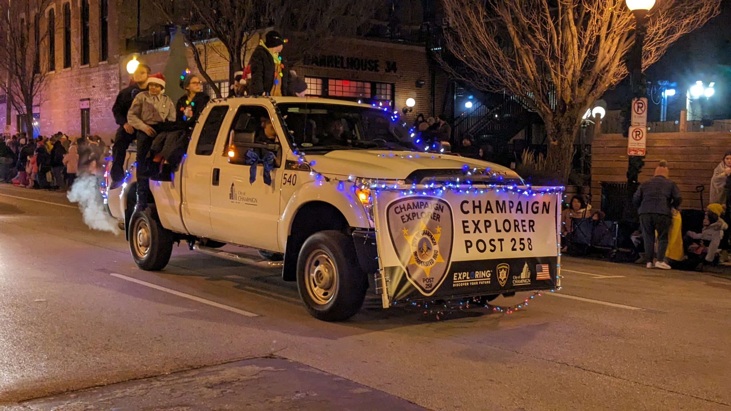 There was a chill in the air but plenty of warm hearts at the annual Parade of Lights in Downtown Champaign on November 25, 2023. Thousands of twinkling lights put smiles on the faces of kids of all ages as shimmering floats wove their along the crowded downtown streets. City of Champaign parade participants included City Council members, Police, Fire and Public Works Departments, Police Explorers, and other City staff and family members. What a great way to start the busy holiday season!